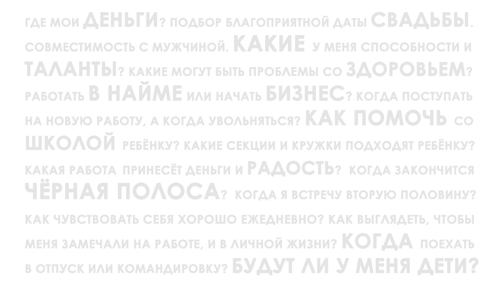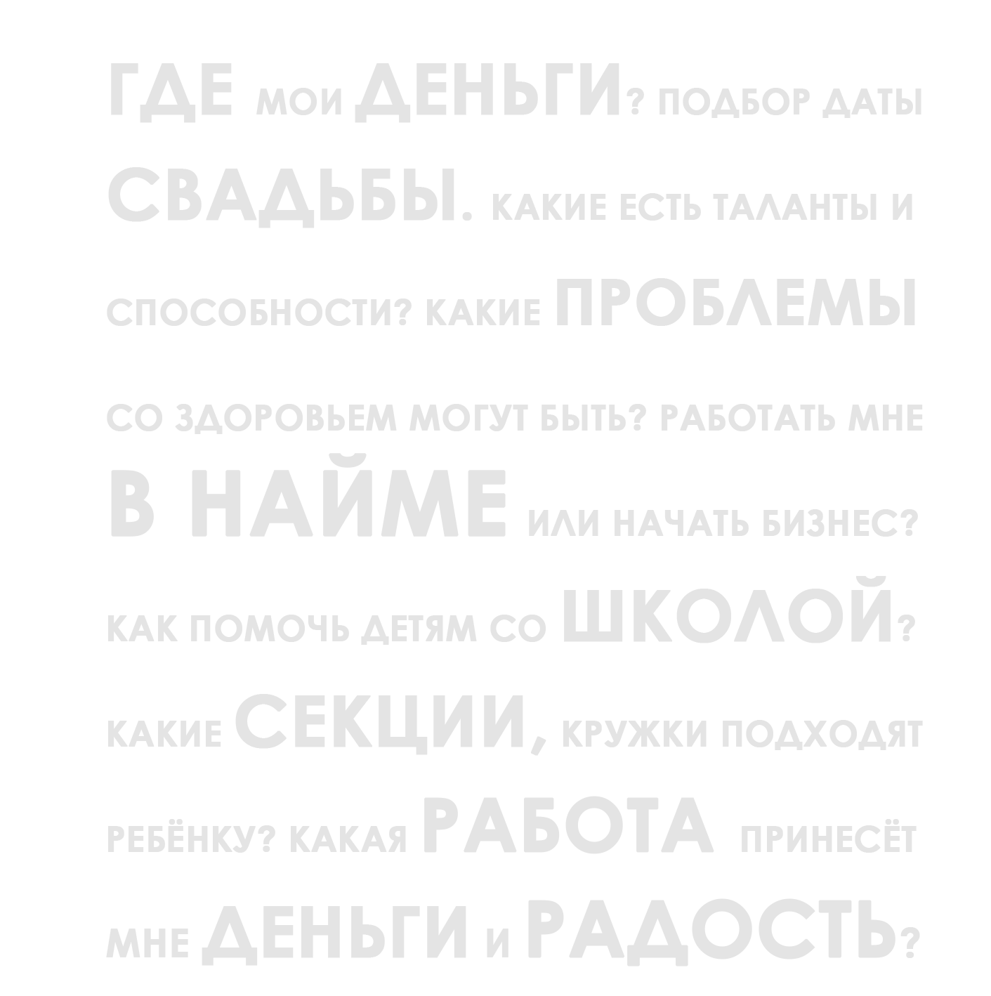 Позволяет узнать, что принесет вам предстоящий год в таких сферах как: личная жизнь, семья, карьера, здоровье, финансы, поездки, дети и других. Дополнительно в анализе учитываю не менее четырех методов прогноза.