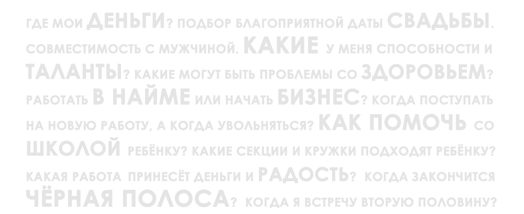 Позволяет узнать, как будут складываться обстоятельства и развиваться события, что принесет вам предстоящий год в таких сферах как: личная жизнь, семья, карьера, здоровье, финансы, поездки, дети и других.